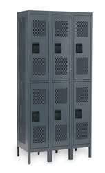 Unassembled Locker, Ventilated, 3 Wide, 6 Openings, Double Tier, Hooks per Opening Three Single Prong Wall Hooks and One Double Prong Ceiling Hook, Multi-Point Automatic Locking System, Opening Width 9 1/2 In, Opening Depth 16 1/2 In, Opening Height 34 In, Overall Width 36 In, Overall Depth 18 In, Overall Height 78 In, Gray, Cold Rolled Steel, Powder Coat Finish, 6 In Legs, Recessed Steel Handle, Flush Mount Door, Accommodates Built-In Combination Lock, Built-In Cylinder Lock And/Or Padlock