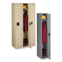 Tennsco single tier lockers are designed for use by single individuals for the security of clothing and personal property. Heavy gauge steel construction with baked on enamel finish assures years of trouble free service, even under the most demanding situations. Doors are equipped with painted locking channels which are completely cushioned for silent operation as well as recessed handles that allow the use of standard size padlocks. Measures 12" width by 72" height by 18" depth. Sand color.