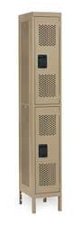 Unassembled Locker, Ventilated, 1 Wide, 2 Openings, Double Tier, Hooks per Opening Three Single Prong Wall Hooks and One Double Prong Ceiling Hook, Multi-Point Automatic Locking System, Opening Width 9 1/2 In, Opening Depth 16 1/2 In, Opening Height 34 In, Overall Width 12 In, Overall Depth 18 In, Overall Height 78 In, Tan, Cold Rolled Steel, Powder Coat Finish, 6 In Legs, Recessed Steel Handle, Flush Mount Door, Accommodates Built-In Combination Lock, Built-In Cylinder Lock And/Or Padlock