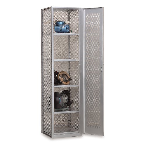 HALLOWELL Storage Locker is constructed of super strong galvanneal steel—carbon steel coated with zinc on both sides by a continuous hot dip process. Galvanneal is harder than regular galvanized coating and more scratch- and damage-resistant.13- to 14-gauge steel frame/sides; 16-gauge steel shelves. All-welded assembly. Expanded metal sides and back; diamond perforated door. Single-point lock. Appropriate for lean manufacturing.